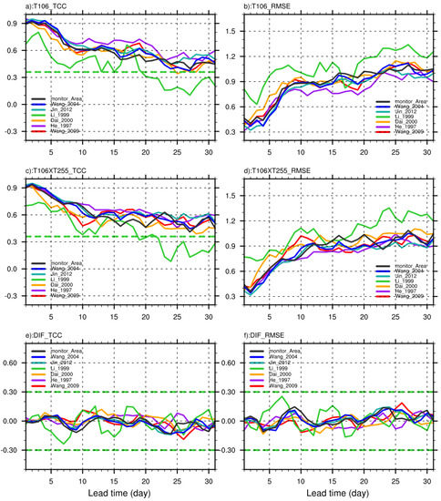 The TCC and RMSE are calculated between reanalysis and prediction for seven indices (Table 1) with lead times of 1–31 days. Figure 6 indicates that with increasing lead times, the TCC (RMSE) shows a general decreasing (increasing) trend. From the prediction of TCC for both schemes (Figure 6a,c) within the lead times of 1–31 days except for Li index [32], the TCC of all indices almost passes the significant test with a 95% confidence level. In addition, the model is more proficient for indices defined in a way that the 850 hPa zonal wind is averaged over a region, such as a China Meteorological Administration (CMA) index (black line), the Wang (2004) index [33], and the Jin index [35]. For indices defined with multiple levels and different regions, the prediction capability shows inconsistent results. For the He index [31], the prediction capability is superior from the 1st to the 31st lead day. However, for the Wang (2009) index which involves two regions and two levels [9], the prediction capability is lower than He index for most lead times, especially from the 7th to 13th lead day, indicating that the prediction capability may decrease when the area expands. Concentrating on Li index, it involves different levels of zonal and meridional winds, and the difference between the two levels of divergence is used as the definition of the index. The model itself is weak in predicting the meridional wind, and the calculation error of the divergence may further make the prediction capability of the Li index weaker. Similar results also exist in RMSE (Figure 6b,d). Additionally, when it comes to the difference between the two predictions (Figure 6e,f), the difference between them is from –0.2 to 0.2 for most of the indices in all lead times. Focusing on the Li index, two schemes show more significant deviations. The fluctuation of prediction bias is obvious with different lead times: in lead times of 5–9 days and 13–16 days, the T106 × T255 has better prediction results than T106, but in lead times of 10–12 days and 17–19 days, the T106 exhibits more advantageous performance.