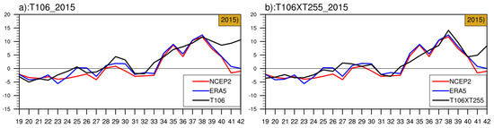 Pentad-by-pentad evolution of zonal wind averages (y-axis; unit: m.s−1) in the SCSSM monitoring area (5°–15° N, 110°–120° E) for 2015 (for lead times of 1–31 days) from 19th pentad to 42nd pentad (x-axis). Red and blue lines indicate the result of NCEP2 and ERA5, respectively, with the black lines representing the two schemes of T106 (a) and T106 × T255 (b).
