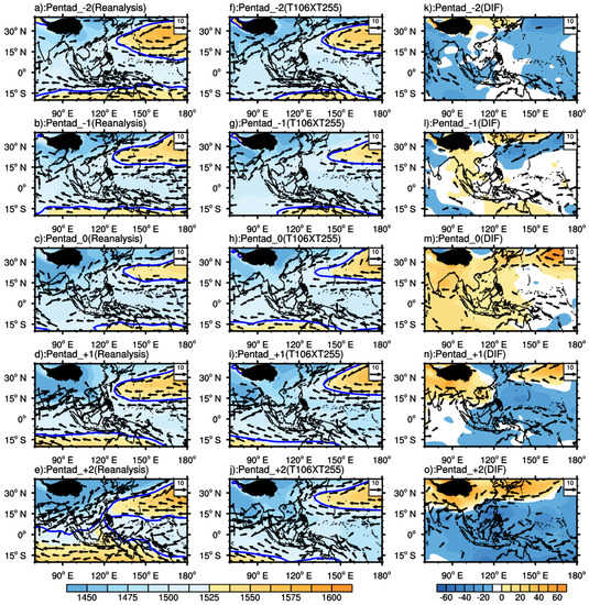 Concerning the circulation case of T106 (Figure 9), pentad 0 is the onset date in the reanalysis data (34th pentad, 2015). The observed results show a clear weakening trend in the WPSH in the east during the onset of SCSSM (32nd–34th pentad). The observed WPSH is significantly weaker than predicted on the 34th pentad. From the 32nd to 34th pentad, the observed results manifest a more apparent negative anomaly in the Bay of Bengal area, corresponding to the formation and deepening development of the Bay of Bengal trough. The southwestern airflow in front of the trough travels eastward and accelerates to the SCS. From the beginning of the 33rd pentad, the observations display a more pronounced “vortex pair” near the equator (80° E), followed by the onset of SCSSM, but the model fails to capture this critical signal. From the beginning of the onset pentad (34th pentad), an obvious easterly wind anomaly appears along the Bay of Bengal, which means that the model fails to reasonably predict the strengthening of the westerly wind. Meanwhile, the observed intensity of WPSH is much weaker than that of predictions, corresponding to the fact that the onset of SCSSM is earlier in the prediction, which has finished the weakening and eastern withdrawal of WPSH. Similar results can be found in T106 × T255 (Figure 10). By comparing the predicted results of the two schemes, the prediction of the SCSSM onset date is significantly earlier for both models at the same lead time, but the prediction of the WPSH intensity in T106 is more potent than that of T106 × T255 before and after the SCSSM onset. In other words, the prediction of T106 for the WPSH intensity is more deviated from the actual situation during the onset.
