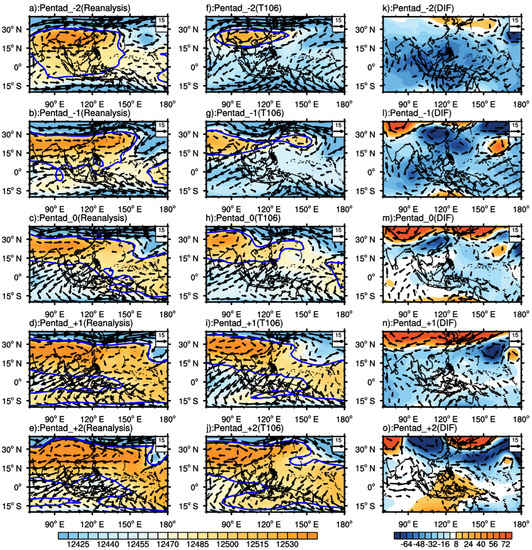 For the higher-level troposphere, the SAH shifted northward from the 32nd to the 33rd pentad. Its intensity increased, and the jet stream was significantly enhanced on both sides (Figure 11a–c). In the prediction of T106, the main body of SAH is northward and weaker, and it is on the northwest side of the Indochina Peninsula. Starting from the 33rd pentad (Figure 11g), the SAH has a breaking trend and breaks at the 34th pentad (Figure 11h). Compared with the observed results: a negative anomaly exists, and the cyclonic anomaly is prominent (Figure 11k–o), which means that CAMS–CSM could not reasonably capture the intensification of SAH in 2015. Concerning the location of the SAH, it is speculated that the SAH may have completed its advance to the northwest in the predicted results of T106, i.e., the SCSSM has already erupted in T106. In the predicted results of T106 × T255 (Figure 12), the overall prediction results are similar to those of T106, with a more reasonable prediction of SAH intensity and smaller deviation in the wind field than T106 (Figure 12k–o).