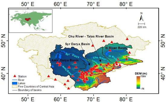 Central Asia is located in the heart of Eurasia, comprising Kazakhstan, Kyrgyzstan, Tajikistan, Turkmenistan, and Uzbekistan. Rivers in Central Asia include the Amu Darya, Syr Darya, Chu River, Talas River, Ili River, etc. Central Asia is deeply inland, far from the oceans. It has a semi-arid and arid climate, with low annual precipitation and strong evaporation [42,43]. According to the IPCC report, the temperature in Central Asia continues to increase, and the precipitation pattern also tends to vary enormously [44]. Due to the high drought risk and vulnerability, a drought-monitoring study in this region is particularly important. However, drought monitoring in these regions suffers from sparse and uneven gauges with a large number of missing values. Therefore, this paper mainly focuses on the four major river basins where there are relatively dense gauge sites. As Figure 1 shows, the four basins are the (1) Amu Darya basin, (2) Syr Darya basin, (3) Chu-Talas River basin, and (4) Ili River basin.