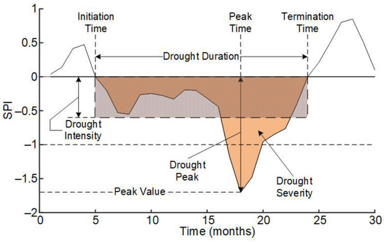 Yevjevich [48] first proposed the run theory, which has become an important tool for identifying and describing drought events. According to McKee et al. [47], a drought event is defined as a period with SPI values lower than 0 and the lowest value is less than −1. In this study, only drought events with a duration of more than two months are considered. Once drought events are identified, they can be represented by run theory. A run refers to the part of the time series where the value is continuously lower or higher than a certain threshold. The higher part is the positive run, which indicates that the period is relatively wet; the part below the threshold is the negative run, indicating that the period is relatively dry. The following figure (Figure 2) depicts a drought event and its basic characteristics [49].