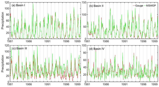 The precipitation temporal evolution of ground sites and MSWEP in each basin.