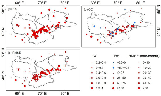 The SPI3 spatial patterns of CC, RB, and RMSE between sites and MSWEP.