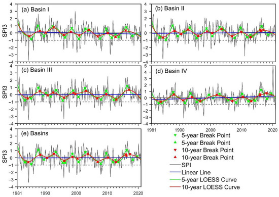 Considering the four basins as a whole (Figure 8e), the linear trend line of SPI3 from 1981 to 2020 coincides with the zero line, indicating that the study area shows no signs of drought or wetness. According to the LOESS curve and its turning points, the four basins showed periodic fluctuations of 3–5 years’ scale and a certain degree of drying after 2013. From 1981 to 2020, Basin II (a slope of 2.76) and Basin III (a slope of 6.79) displayed no significant dry/wet changes. Basin I showed a slight drying trend (a slope of −4.55), while Basin IV demonstrated a slight wet trend (slope of 7.91), and both passed the 0.01 significance level test. According to the 5-year local trend line, around 1984, 1995, and 2013, each basin had a trend of wetting, but the fluctuation range was small. Consequently, each of them remained in a drought state. After 2018, the smooth trend lines of Basin I (Figure 8a) and Basin II (Figure 8b) tended to flatten out, indicating that drought in the study area gradually grew stable and the impact of drought became increasingly insignificant. It can be seen from the 10-year smoothing trend line that the local smoothing curve tended to flatten out. It fluctuated at 0 around 1990 and 2010, indicating that the drought trend was relatively stable during this period. After 2013, it showed a drying trend.