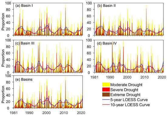 Drought area is one of the key indicators for describing drought. To analyze the temporal variation characteristics of drought areas, the area percentages of moderate, severe, and extreme drought conditions from 1981 to 2020 were calculated month by month according to the drought classification standard (Table 2). In Figure 9, the LOESS local regression lines for the 5-year and 10-year spans are represented by the solid green line and the solid red line, respectively, and moderate drought, severe drought, and extreme drought are represented by yellow, red, and brown areas, respectively.