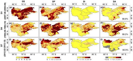 Spatial distribution of DS, DI, DP, and DA of the three drought events for (a–d) D1, (e–h) D4, (i–l) D7.