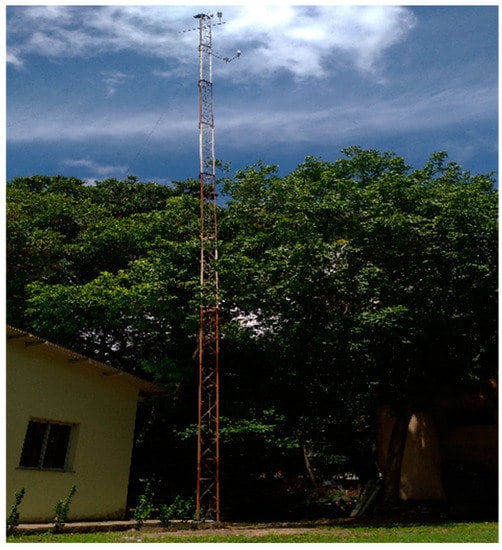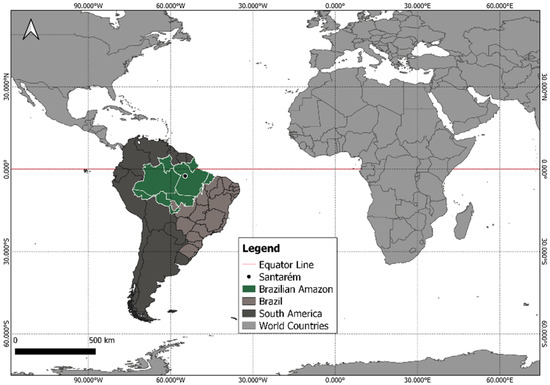 Santarém (2°25′ S, 54°44′ W) is situated in the western Pará, in the north of Brazil at approximately 51 m above sea level (Figure 1). The city fits into the climatic type Am, that is, the climate is humid equatorial with a well-defined dry and wet seasons [27]. The rainy season generally lasts from January to June and the dry season comprises the months between July and December [28]. It has little variability in relative humidity, air temperature, atmospheric pressure, and wind speed, due to being located in tropical latitudes close to the Equator [29].