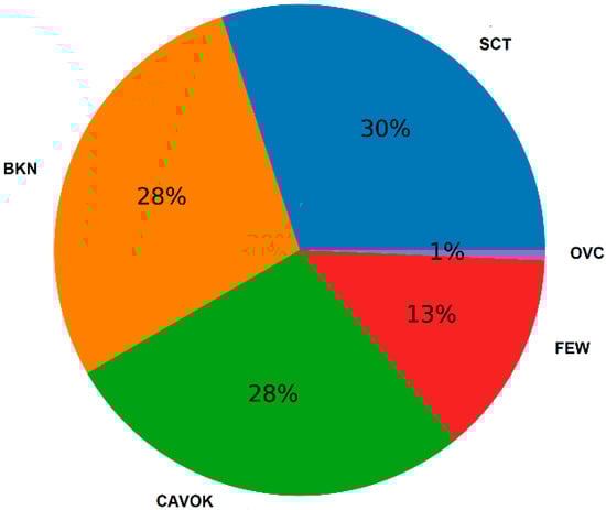 In this work, it is considered clear sky 0 oktas, denoted by the acronym CAVOK (“Ceiling in Visibility OK”) and 1 to 2 oktas, denoted by the acronym FEW. [35] used a threshold of 20% of a cloud fraction measured by an all-sky camera, with up to about 70% of the clear sky condition in their survey of the Inter-Comparison Campaign of UVR Instruments under Clear Sky Conditions at Reunion Island (21° S, 55° E). Therefore, 0, 1 and 2 oktas can be used to represent clear skies, as they represent less than 30% sky coverage.