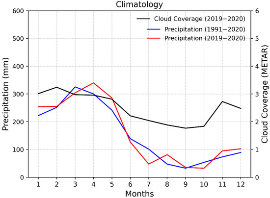 The climatology of the cloud cover using METAR data and precipitation using data obtained for free from the INMET (National Institute of Meteorology) website were also calculated (Figure 4) in order to illustrate the rainy and dry season divisions adopted in this work.