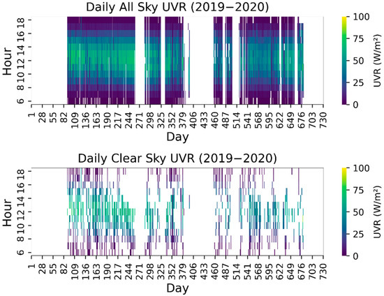 A two-year period of data (April 2019 to November 2020) was measured. The UVR data were collected continuously with a sampling frequency of 1 Hz, in watts per square-meter unit, and using the Campbell Scientific model CR10X data logger. The missing days are due to the period in which the sensor had not arrived and due to some technical problems.
