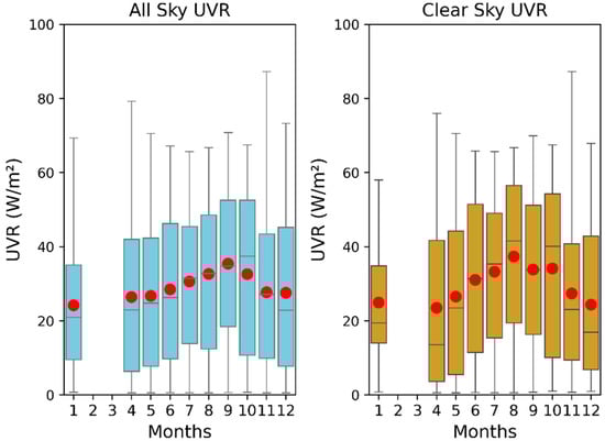 3.2. UVR Monthly Average in Clear Sky and All Sky Conditions