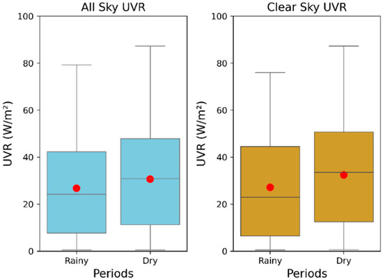 The monthly distribution of the data was also performed, as well as the seasonal distribution of the year: Rainy period (January, February, April, May, and June) and dry period (July, August, September, October, November, and December). The average over the study period for UVR in the two sky conditions was also calculated. Although the dataset does not cover a sufficient period to be climatologically significant, the monthly variability and the differences between clear sky and all-sky UVR present interesting results.
