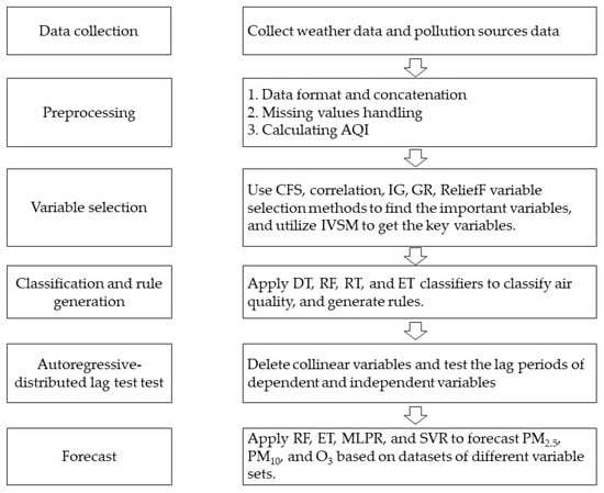 - Forecast concentrations of PM2.5, PM10, and O3 by using four intelligent time-series forecast methods based on IVSM-selected variables, ARDL-selected variables, and full variables.