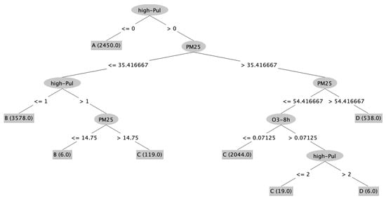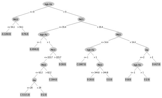 Climate abnormalities have caused more air pollution, and serious air pollution problems have increased human health concerns. To find important pollutants in the current study, we used CFS, correlation, IG, GR, and ReliefF to select the important variables, and we synthesized the results of these five selection methods based on the IVSM. That is, at least four of these methods selected the same variables as the key variables. Next, we applied four classifiers (DT, RT, RF, and ET) to classify air quality and generate rules for determining important pollutants. The study was based on the following: (1) the chosen classifiers must be rule-based because DT is a commonly used baseline method and ET is an extension of RF; (2) rule-based ensemble classifiers generally perform better than the individual classifiers they are constructed of and overcome the limitations of the individual classifiers []; hence the selected classifiers must have been used in the literature and shown excellent performance, and (3) the computational cost of a rule-based classifier is very low and is less computationally expensive than neural networks and deep learning.