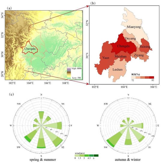 Distributions of (a) topography, (b) relative humidity distribution and (c) wind rose map of the study area.