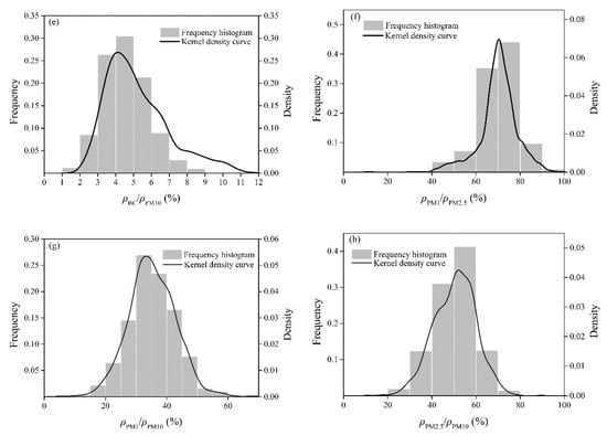 Frequency histogram and Kernel density curve. (a–h) represent the frequency histogram and kernel density curve of E, RH, ρBC/ρPM1, ρBC/ρPM2.5, ρBC/ρPM10, ρPM1/ρPM2.5, ρPM1/ρPM10 and ρPM2.5/ρPM10, respectively.