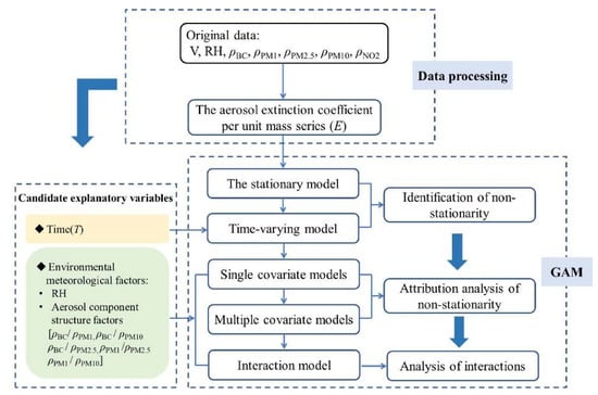 Figure 2 shows the frequency histogram and kernel density curve of the aerosol extinction coefficient per unit of mass and the environmental meteorological factors. Seen from Figure 2a, the aerosol extinction coefficient per unit of mass shows a right-skewed characteristic, so it is preliminarily set that the change of the extinction coefficient per unit of mass conforms to the Gamma distribution. In Figure 2a, the red curve is the density distribution curve fitted by Gamma, which is consistent with the kernel density curve. Therefore, in this study the Gamma function is selected as the distribution function of GAMs. At the same time, from the frequency histogram and kernel density curve of environmental meteorological factors, it can be observed that all factors are similar to the distribution of the aerosol extinction coefficient per unit of mass, which basically conforms to the Gamma distribution pattern. Therefore, in this study the identity link function is used as the link function and the explanatory variables are connected to the response variables that obey the Gamma distribution through a linear combination. Figure 3 presents the framework of non-stationarity analysis of the aerosol extinction coefficient per unit of mass.