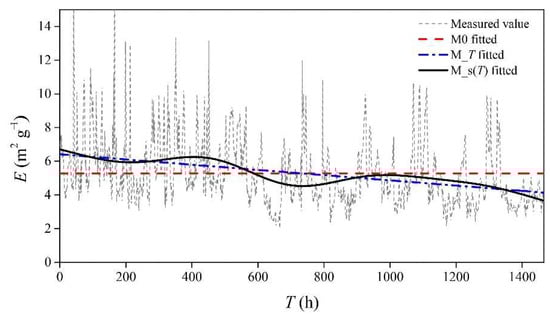 The statistical test provides a preliminary analysis of the non-stationarity of the time series of aerosol extinction coefficient per unit of mass. Firstly, the Mann–Kendall trend test [] was used to identify the trend of the aerosol extinction coefficient per unit of mass in autumn and winter in Chengdu. The results show that the time series of the aerosol extinction coefficient per unit of mass indicates Z = −14.43, which exceeds the critical value of Z = 1.96 (with the significance level of α = 0.05) and presents a significant descending trend. Therefore, the time series of aerosol extinction coefficient per unit of mass can be regarded as a non-stationary series. To further identify its non-stationary characteristics, the stationary model and time-varying non-stationary model are established, respectively: (1) stationary model M_0, with the parameters being constant; (2) linear time-varying model M_T, with the parameters changing as a linear function of time; and (3) non-linear time-varying model M_s(T), in which the parameters change as a non-linear function of time. The model-fitting results are shown in Figure 4 and Table 1. Among the three models, the AIC value of M_s(T) is the smallest, indicating that the parameters for the time series of the aerosol extinction coefficient per unit of mass are time dependent. The non-stationary model performs better than the stationary model, and the time series of aerosol extinction coefficient per unit of mass has nonstationarity. At the same time, it can be seen from the curves that the nonlinear time-varying model can better capture the variation trend of the data than the linear time-varying model, and the variation of model parameters shows a nonlinear relationship with time.