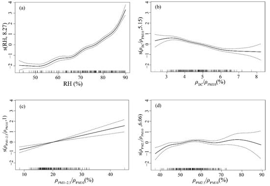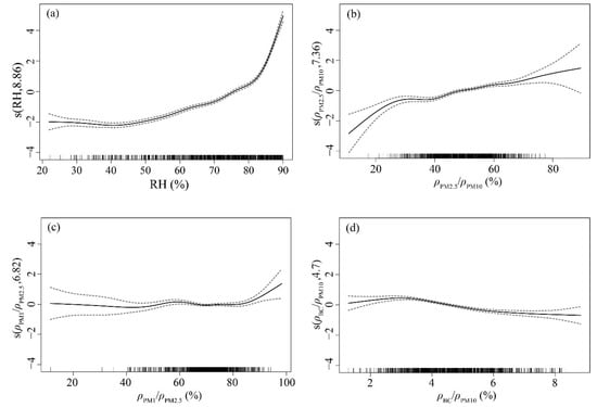 Through the established multiple covariate model, the response graph for the influence of each covariate on the aerosol extinction coefficient per unit of mass is obtained and visually displayed in Figure 6. As can be seen in Figure 6, the dotted line represents the upper and lower limits of the confidence level; the solid line represents the smooth curve of the aerosol extinction coefficient per unit of mass based on the explanatory variable; the x-axis represents the measured value of the explanatory variable; the y-axis represents the smooth-simulated value of the aerosol extinction coefficient per unit of mass, and the value in parenthesis on the y-axis represents the estimated degree of freedom. In Figure 6a it indicates that the aerosol extinction coefficient per unit of mass has a non-linear positive correlation with the RH. When the RH > 80%, the aerosol extinction coefficient per unit of mass increases rapidly with the RH. This is consistent with the research results of Liu et al. and Chen et al. []. Figure 6b indicates the nonlinear relationship that the aerosol extinction coefficient per unit of mass increases with ρPM2.5/ρPM10. The proportion of organic carbon, sulfate and nitrate in PM2.5 in the Chengdu area is relatively large. The increase in the proportion of fine particles in coarse particles leads to the increase of aerosol hygroscopicity, so the aerosol extinction coefficient per unit of mass increases []. In Figure 6c, the aerosol extinction coefficient per unit of mass changes more slowly with the increase of ρPM1/ρPM2.5. In Figure 6d, the aerosol extinction coefficient per unit of mass decreases with the increase of ρBC/ρPM10. This may be related to the non-hygroscopicity of BC and the mixed state of BC []. Due to the absorbability of BC, it can adsorb a large amount of sulfate, nitrate, etc., thereby increasing the size of aerosol particles. According to the condensation growth formula, the larger the particle is, the slower the growth process of particle size []. Therefore, it affects the hygroscopic growth of aerosol particles.