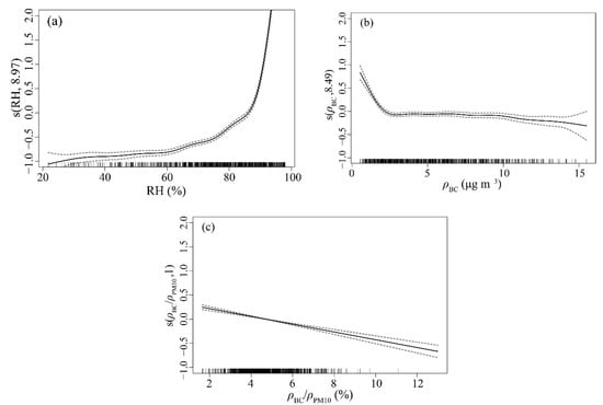 To further clarify the effect of BC on the hygroscopic growth of aerosol particles, aerosol scattering hygroscopic growth factor (f) was selected as the response variable, RH, ρBC and ρBC/ρPM10 were used as explanatory variables, and a GAMs model was established. It can be seen from the model results (Table 5) that RH, ρBC and ρBC/ρPM10 all passed the significance test of α = 0.001. These three factors can well represent the growth factor of aerosol scattering hygroscopicity, of which RH has the greatest effect, followed by ρBC/ρPM10, and the smallest effect is from ρBC. The R2 and explained variance of the model are 0.72 and 89.5%, respectively, and the fitting effect of the model is good. The response graph for the influence of each covariate on f is obtained and visually displayed in Figure 7. In Figure 7a, f has a nonlinear positive correlation with RH. When RH > 80%, f increases rapidly with the increase of RH. While in Figure 7b,c, f shows a decreasing trend with the increase of ρBC and ρBC/ρPM10, which illustrates that the hygroscopic growth effect of aerosol particles is weakened, which is consistent with the research results of Zhang et al. []. Aerosol hygroscopic growth caused by RH changes has the greatest influence on the aerosol extinction coefficient per unit of mass. When ρBC/ρPM10 increases, f decreases. In addition, due to the non-hygroscopicity of BC [], the hygroscopic growth effect of aerosol particles is weakened, so the extinction coefficient per unit of mass of aerosol tends to decrease.