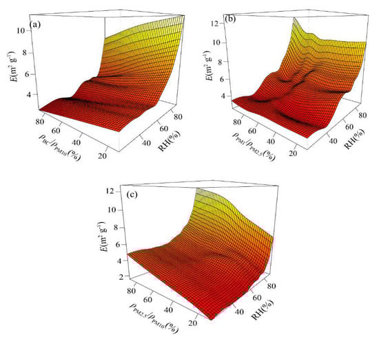 Three-dimensional graphs for the influence of the interaction between the RH and aerosol components on the change of aerosol extinction coefficient per unit of mass. (a–c) represent the RH-ρBC/ρPM10, RH-ρPM1/ρPM2.5 and RH-ρPM2.5/ρPM10, respectively.