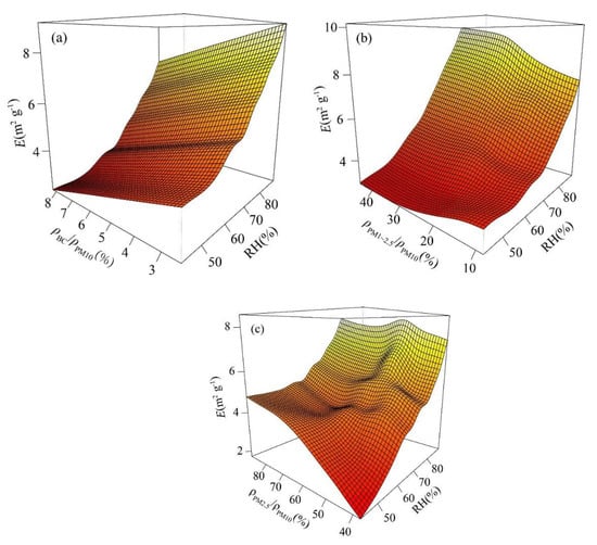 Based on the fitting results of the non-stationary model with the interaction effect, the cross-term effect of RH and the aerosol component structure factors on the change in the aerosol extinction coefficient per unit of mass is given in Figure 9. In Figure 9a, when the RH is larger and ρBC/ρPM10 is smaller, the aerosol extinction coefficient per unit of mass tends to increase. As can be seen in Figure 9b, when ρPM1/ρPM2.5 remains unchanged, the aerosol extinction coefficient per unit of mass increases with the RH. When the RH is larger and ρPM1/ρPM2.5 is greater than 80%, the aerosol extinction coefficient per unit of mass has a significant ascending trend. When ρPM2.5/ρPM10 and the RH are both at maximum, the corresponding aerosol extinction coefficient per unit of mass is the largest, indicating that the high RH and high ρPM2.5/ρPM10 have a significant synergistic effect on the change in aerosol extinction coefficient per unit of mass. In summary, the synergistic effect of high RH, high ρPM2.5/ρPM10, high ρPM1/ρPM2.5 and low ρBC/ρPM10 is conducive to the increase of the aerosol extinction coefficient per unit of mass, which shows the non-stationary evolution of the aerosol extinction coefficient per unit of mass due to the different properties of aerosol component structure factors under different RH conditions