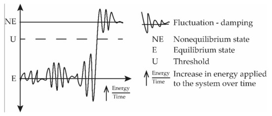 Prigogine observed that, far from the equilibrium situation, new ordered structures spontaneously arise [30] that require an input of energy to be preserved. However, they do not maintain linear relationships and are not possible to predict with current tools, precisely because of their nonlinear nature, as it occurs with the atmospheric interaction at ground level [31]. Close to the point where dissipative structures are organized, large fluctuations are observed that, instead of being dampened, can expand throughout the system, leading to new situations that are qualitatively very different from those that are close to equilibrium. It is necessary to distinguish equilibrium conditions (E), nonequilibrium conditions (NE), the process that leads from one to the other and the threshold (U) that separates both, as described qualitatively in Figure 1: initially, there are E (whatever these are) in which fluctuations occur with respect to said conditions that are dampened over time. If energy is supplied to the system, the fluctuations become large, but the system still manages to dampen them, until a point is reached where a certain threshold is exceeded, U. The fluctuation is no longer damped but stabilizes in a state far from the original equilibrium but equally stable as long as the energy supply continues, that is, a dissipative structure [4,32]. The dissipative structure, at the level of the earth’s surface, may have as one of its origins the Kolmogorov cascade [33]. The cascade supplies energy that favors the formation of unstable and turbulent structures near the surface.