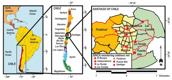 - Chilean Air Quality National Information System (SINCA). Available online: https://sinca.mma.gob.cl (accessed on 30 April 2022).