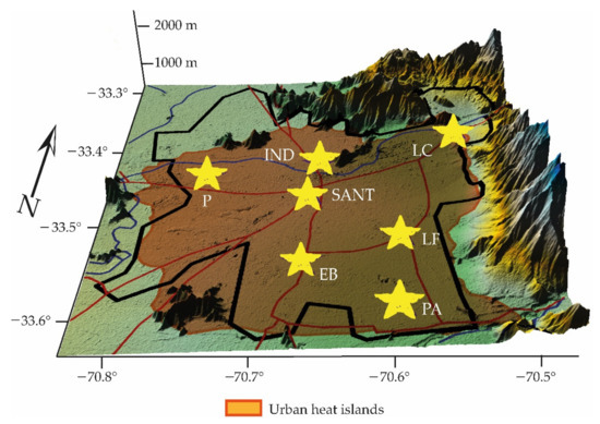 The selection of ozone (O3) was based on the fact that it has an adverse effect on the respiratory system of the inhabitants. In addition, it generates a picture of pre-existing diseases before the advent of COVID-19. On the other hand, in the Metropolitan Region, there is a connected urban meteorology that arises from urban heat islands (Figure 3) and urban canyons, as well as from the basin geography of the area. There are many local climatic zones depending on the size and complexity of the city. Therefore, the sectors can be recognized according to their predominant socioecological characteristics. These sectors make up socially constructed climates based on the socioeconomic levels of their inhabitants. They can be very connected with their interior and/or exterior, favoring the spread of a disease [4,48].