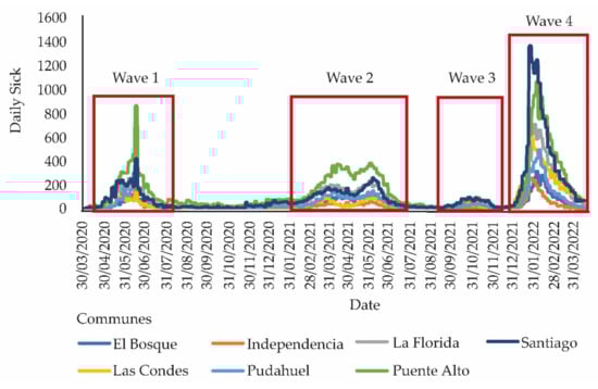The study period covered 25 months, from 31 March 2020 to 18 April 2022. This time corresponded to a stage of rapid growth of the pandemic (which included three decreasing contagion waves over time until the end of 2021) in the Metropolitan Region [42] (Figure 4).