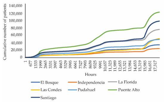 Figure 5 presents the accumulated number of patients by commune of the study in the period from 30 Mach 2020 to 18 April 2022.