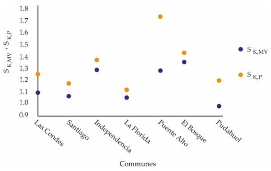 From Table 3, Figure 6 was obtained, from which it follows that SK, MV < SK, P. That is, the most entropic—those with the greatest connectivity in the city— are the pollutants. Figure 6 shows the influence exerted on the accumulated patients (of each commune) by their localized climatology (which is characterized by temperature, relative humidity and the magnitude of wind speed) and pollutants (PM2.5, PM10 and O3). In addition, it can be seen that those with the highest entropy are the pollutants, which, in turn, can favor the spread of the virus depending on the characteristics of the urban environment (roughness and densification).