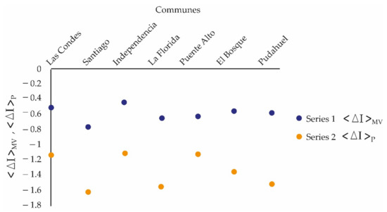 Calculating from Table 3 the averaged fractal dimension () [52] for (accumulated patients)/(meteorological variable), , and for (accumulated patients)/(pollutant), , for each commune, Table 6 is obtained: