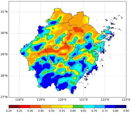 According to Equations (3) and (4), based on the above indices, CDI was calculated and analyzed as shown in Figure 2. Recorded CDI values were relatively higher in the northwest and southwest of Zhejiang. In other regions, such as the central and northern areas and the southeast coastal region, due to higher average temperature, lower relative humidity and faster wind speed, comfortable days, corresponding to BCMI index grades 4–6, were less. In general, the high-altitude area of Zhejiang was more comfortable, with a CDI value of more than 0.5. Other regions were relatively low.