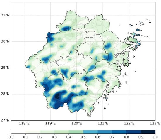The spatial distribution of vegetation coverage in Zhejiang province was obtained using remote sensing satellite data. Most areas had more than 50% vegetation coverage, though some plain and coastal areas had a vegetation coverage of less than 50%. On this basis, we used GIS to calculate the average vegetation coverage of villages in Zhejiang province according to Equation (6), and normalized the VCI of Zhejiang province in summer, as shown in Figure 3.