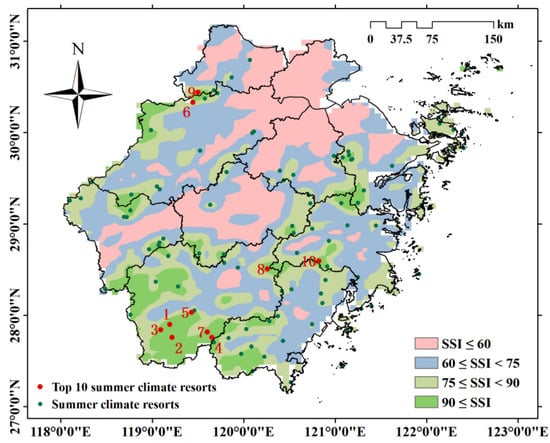 Distribution of SSI in Zhejiang Province. Green dots are the summer climate resorts, red dots are the top 10 summer climate resorts and red number is the rank corresponding to Table 3.