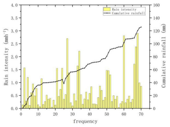 Average rainfall intensity and cumulative rainfall of 70 precipitations in the Yushu area.