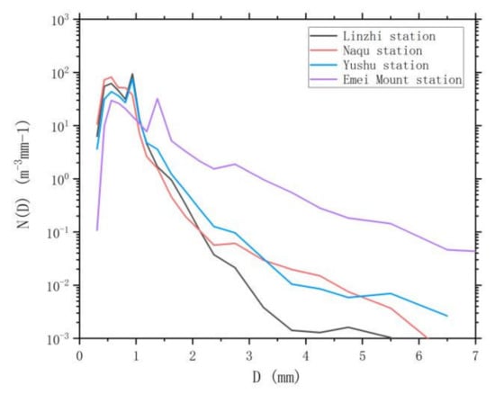 (1) The spectra of the four stations all showed a multi–peak structure, the peak at Linzhi station was the largest, and the peak at Emei Mount station was the smallest. The overall raindrop spectral concentration decreased with the increase in particle size after 0.562 mm. The raindrop spectral concentration of Linzhi Station had the most obvious downward trend with the increase of particle size after the peak.
