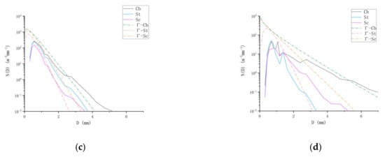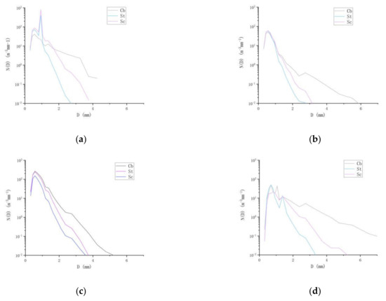 Table 1 shows the proportions of the three types of cloud precipitation samples at the four stations. Linzhi Station, Naqu Station and Emei Mount Station have the largest proportion of stratiform cloud precipitation samples, and Yushu Station has the largest proportion of cumulonimbus precipitation samples. The station has the largest number of cumulonimbus precipitation samples, followed by Mount Emei station. Figure 6 shows the distribution changes of three types of precipitation cloud and raindrop spectra at four sites. When the particle size is greater than 1.875 mm, the raindrop spectra of the four stations are that the cumulonimbus precipitation Cb is in the uppermost layer, the stratiform cloud precipitation St is in the lowermost layer, and the mixed cloud precipitation Sc is in between. It shows that when the particle size is greater than 1.875mm, the raindrop spectral concentrations of the four sites are in the same particle size order: Cb > Sc > St, and the larger the concentration, the wider the spectral width. The spectral concentrations of raindrops at Linzhi Station, Yushu Station and Nagqu Station are significantly larger than those at Emei Mount Station, indicating that the summer precipitation cloud activity in the plateau region is stronger than that in the eastern edge of the plateau. The spectra of the three types of cloud precipitation in the Yushu area all show a single peak shape, the peak is located at about 0.562 mm, and the maximum raindrop sizes of the three types of cloud precipitation in the Yushu area are 5.2 mm, 3.7 mm and 3.5 mm, respectively. The raindrop spectra of the three types of cloud precipitation at Linzhi Station, Emei Mount Station and the cumulonimbus precipitation at Naqu Station are multi-peak structures. The peak of the raindrop spectrum can reflect the instability of precipitation, and the multi–peak structure of the spectrum reflects most of the precipitation process. All have instability [27]. When the particle size of the three types of precipitation clouds at Emei Mount Station is about 1.375 mm, the falling velocity of the particle size decreases suddenly, resulting in the peak concentration here. The decreasing trend of raindrop spectral concentration in the large droplet section at the four stations becomes smaller with the increase in particle size, which may be related to the collision and merging of small raindrops or the fragmentation of large raindrops when falling.