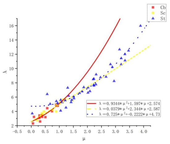 Scatter plots μ–λ relations and fitting curves for three types of rainfall.