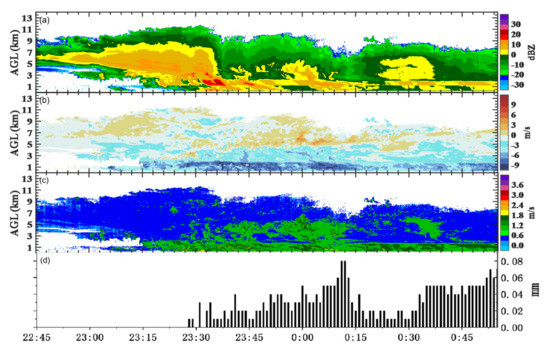 Cumulonimbus precipitation in Yushu area from 22:45 on 23 August 2019 to 00:45 on 24 August Beijing time observed by Ka-band millimeter cloud radar, (a) reflectivity factor, (b) radial velocity, (c) Velocity spectrum width, (d) Precipitation.
