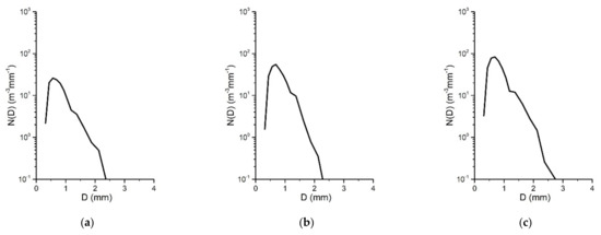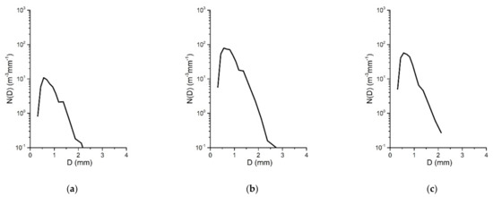 Raindrop size distributions of stratocumulus rainfall in 15 min: (a) 19:30; (b) 19:45; (c) 20:00 BT.