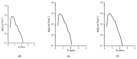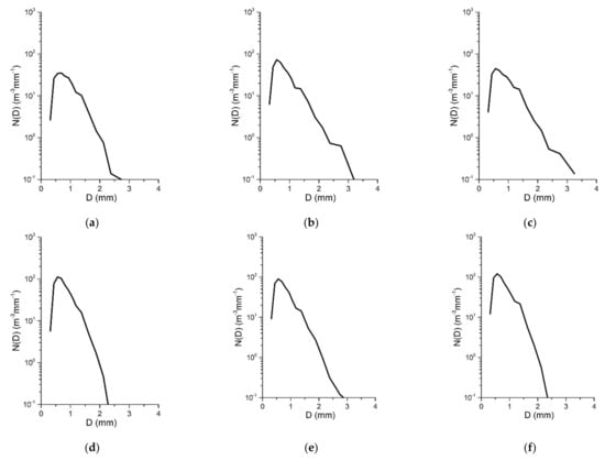 Raindrop size distributions of stratiform rainfall in 15 min: (a) 23:00; (b) 23:15; (c) 23:30; (d) 23:45; (e) 00:00; (f) 00:15 BT.