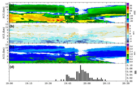 Same as Figure 9 during 19:00–22:00 BT 19 August 2019. (a) reflectivity factor, (b) radial velocity, (c) velocity spectrum width, (d) rainfall.