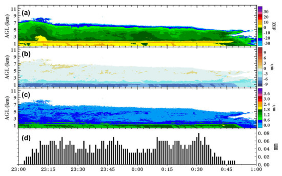 Same as Figure 9 during 23:00–next day 01:00 BT 12 August 2019. (a) reflectivity factor, (b) radial velocity, (c) velocity spectrum width, (d) rainfall.