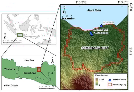 Semarang is the capital of Central Java province and is one of the largest cities in Indonesia. It is particularly prone to damaging flooding, due to tidal flooding from the sea and flash floods from the upper inland area []. This city is located on the northern coast of Java Island at 658 S 11025 E (Figure 1). On Saturday, 6 February 2021, the city was hit by the flash floods triggered by extreme rainfall that inundated Semarang City and various areas of 10 subdistricts from Friday to Saturday []. According to the Agency for Meteorology, Climatology, and Geophysics (BMKG), the daily extreme rainfall intensity on 5 February 2021 was recorded up to 163.7 mm and 183 mm at the Klimatologi and Beringin Asri local weather stations, respectively. The flash floods triggered by this extreme rainfall were one of the most damaging flood events in the last 10 years. It is estimated that 972 residents were evacuated from their homes, and many more reported severe property damages [].