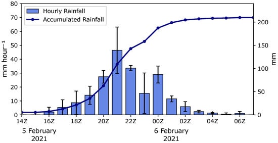 Time series of hourly rainfall averaged from three rain gauge stations. The vertical line indicates a standard deviation and the contour line indicates accumulated precipitation from 00Z 5 February to 07Z 6 February 2021.
