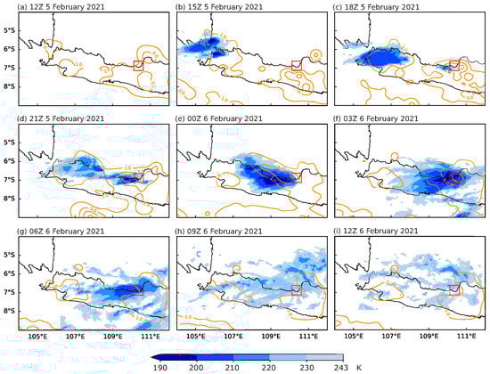Three-hourly evolution of the MCS (K, shaded) from Himawari-8 satellite superimposed with rainfall rate from GSMaP (mm.h, contour) for the period of 5 February at 12Z to 6 February 2021 at 12Z. The location of Semarang is denoted by a red box.