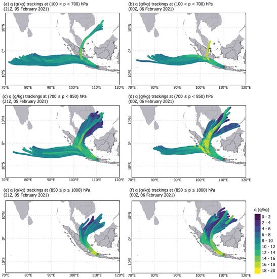 To determine the sources of moisture for the devastating precipitation event in Semarang in early-February 2021, moisture transport was tracked using a Lagrangian approach with a HYSPLIT model at the two rainfall peaks (i.e., 21Z on 5 February 2021 and 00Z on 6 February 2021). In general, the moisture transport towards the flooding region can be grouped into three clusters: the bottom/near surface layer () hPa, the middle layer () hPa, and the upper layer () hPa. Figure 4 shows the backward trajectories of moisture calculated for each of the layers that were defined above. In the upper layer, the moisture transport over Semarang is mostly dominated by the zonal transport originating from the Indian Ocean (Figure 4a,b). In the middle layer, enhanced moisture over Semarang is a combination of the meridional transport from the South China Sea and the zonal transport from the Indian Ocean (Figure 4c,d). Tracking over the bottom layer indicates that moisture is transported from the South China Sea towards Semarang (Figure 4e,f). In particular, the specific humidity (q) along pathways is considerably higher (around 16 to 18 g/kg) over the MCS formation location (Figure 4e,f). Moreover, moisture content over the middle and upper layers is quite comparable.